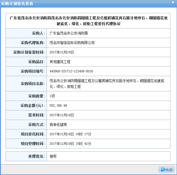 二、采購項目名稱:茂名市公安消防局圍墻工程及公寓房鋪花崗石路牙地坪石、砌圍墻花池硬底化、綠化、廚柜工程